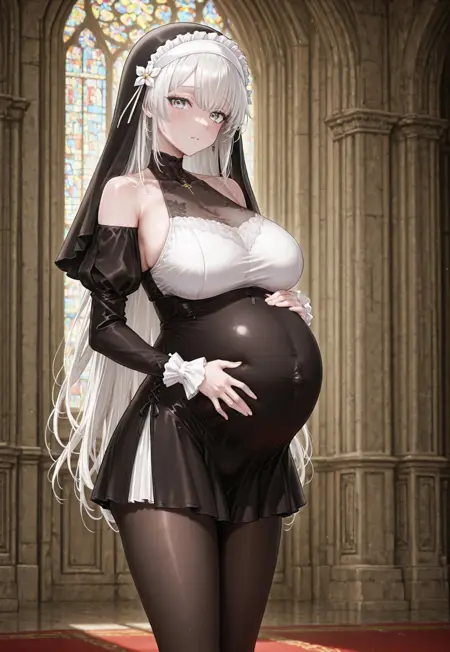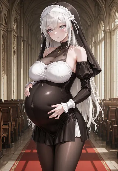 Clothes trigger : nun, non-traditional habit, black pantyhose, halterneck, short skirt,