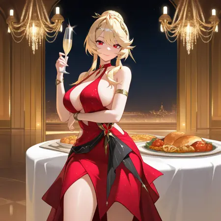 HeraAG, Hra_Evg, 金发, 红眼, 发髻, 编发, 裸腿, 无袖连衣裙, 鸡尾酒裙, 红色连衣裙, 中央开衩, 红宝石, 领饰宝石, 红色项圈, 手臂环饰, 侧边开衩, 红色蝴蝶, 侧缝, 中长裙摆, 红色裙摆, 闪粉, 金色手镯, 发饰, 珠宝, 胸针, 透明, 无袖连体衣, 黑色连体衣, 透明露胸, 黑色文胸, 文胸若隐若现,