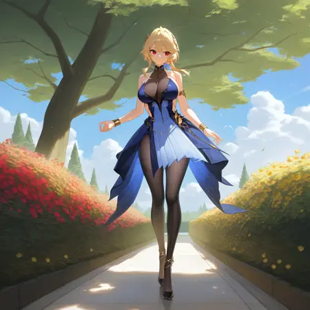HeraAG, Hra_Bsk, 红眼, 金发, 发髻, 编发, 透明露胸, 无袖高领, 遮盖锁骨, 金色链条, 深蓝色连衣裙, 双色连衣裙, 浅蓝色连衣裙, 百褶裙, 无侧边服装, 高低裙摆, 法式编发, 胸前间隙, 交叉系带服装, 鸟类装饰, 条纹, 内裤带, 黑色连裤袜, 金色手镯, 链条腰带, 裸露肩膀, 手臂环饰, 鸟类发饰, 脚踝链, 双色鞋履, 黑色高跟鞋,