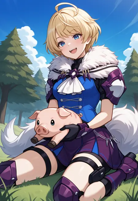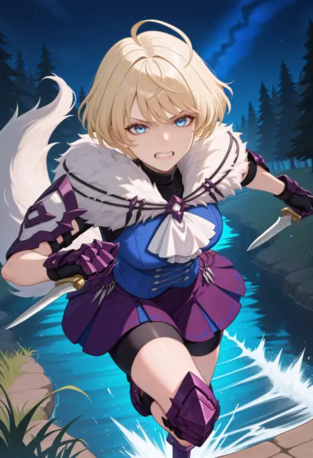 기본 외형: defMerrin, 금발, 단발, 아호게, 파란 눈, 파란 조끼, 흰 스카프, 검은 터틀넥, 짧은 소매, 모피 컬러, 팔꿈치 패드, 장갑, 보라색 치마, 주름 치마, 자전거 바지, 늑대 꼬리, 무릎 패드, 갑옷 부츠, 보라색 신발