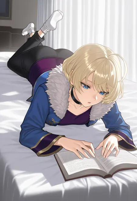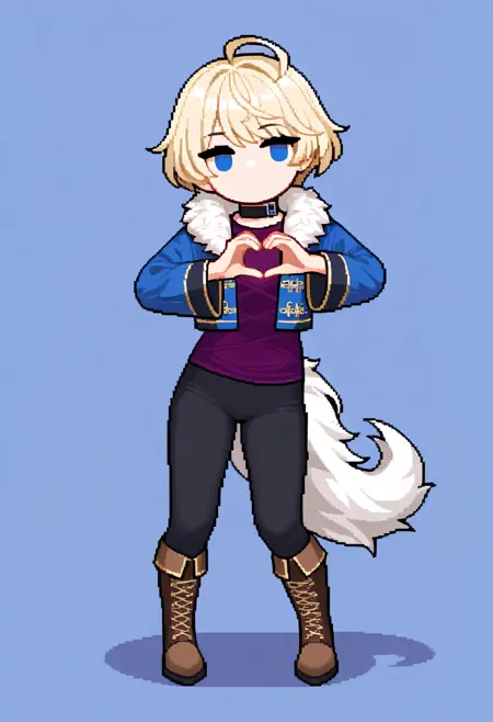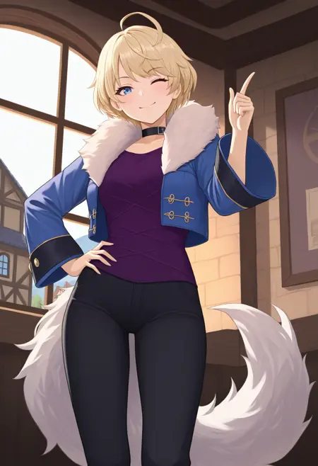 Somniel appearance: casMerrin, blonde hair, short hair, ahoge, blue eyes, black choker, blue jacket, fur-trimmed jacket, cropped jacket, open jacket, long sleeves, purple shirt, black pants, wolf tail
