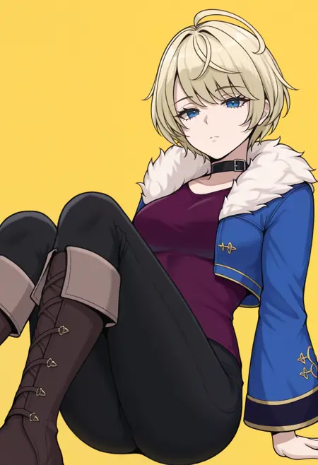 Somniel 외형: casMerrin, 금발, 단발, 아호게, 파란 눈, 검은 목걸이, 파란 재킷, 모피 트림 재킷, 짧은 재킷, 열린 재킷, 긴 소매, 보라색 셔츠, 검은 바지, 늑대 꼬리