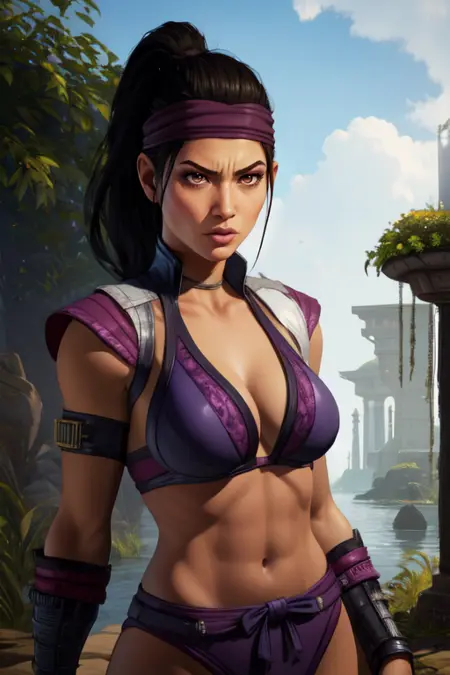 purple top, navel, purple gauntlets, purple bandana, purple underwear, collarbone, shoulder pads,