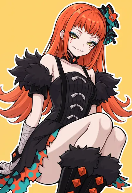기본 외모: defPanette, 주황색 머리, 긴 머리, 머리 리본, 노랑색 눈, 파란색 아이섀도, 빨간색 아이라인, 얼굴 문양, 꿰매인 입, 검은색 목걸이, 검은색 드레스, 어깨 노출, 분리된 소매, 짧은 소매, 모피 장식이 있는 소매, 붕대 감은 팔, 붕대 감은 손, 팔찌, 다색 스커트, 찢어진 드레스, 모피 장식이 있는 부츠, 무릎 부츠, 검은 신발