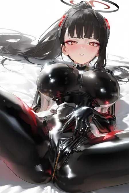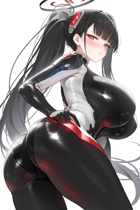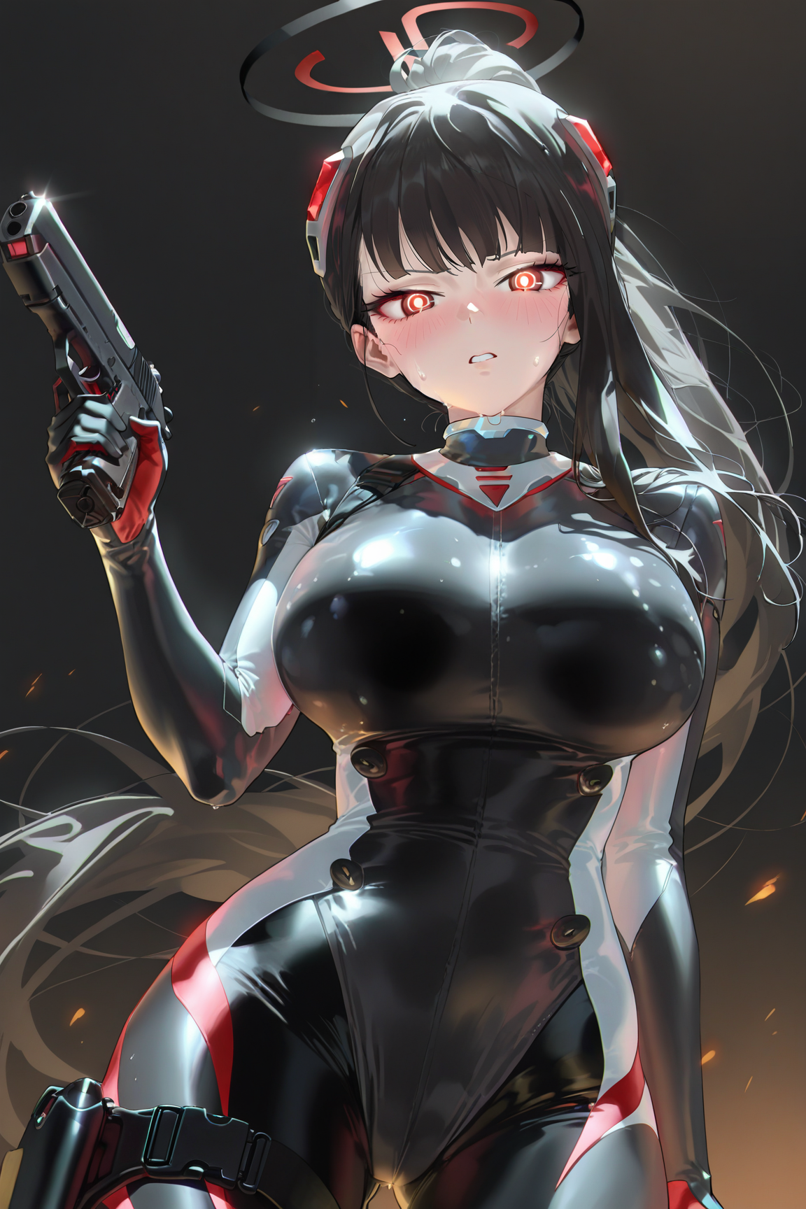 rio \(紧身衣\) \(蓝色档案\), 1girl, 黑发, 红眼, 乳房, 紧身衣, 单人, 光环, 大乳房, 长发, 马尾, 替换服装, 极长发, 黑色紧身衣, 大腿枪套, 明亮瞳孔, 替换发型, 枪套, 头饰, 紧身, 高马尾