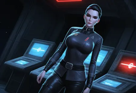 SharaJ, solo, black hair, brown eyes, short hair, slicked back hair, fit and thin, athletic, large breasts, eye liner, make up, military uniform, black pants, boots,