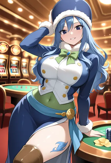 juvia_lfrhndrdyqst, blue eyes, blue hair, long hair, wavy hair, blue headwear, fur hat, fur-trimmed headwear, fur collar, green bowtie, double-breasted, two-tone jacket, blue jacket, white jacket, green shirt, fur-trimmed sleeves, long sleeves, blue sash, jewerly, blue skirt, side slit, brown thigh boots,