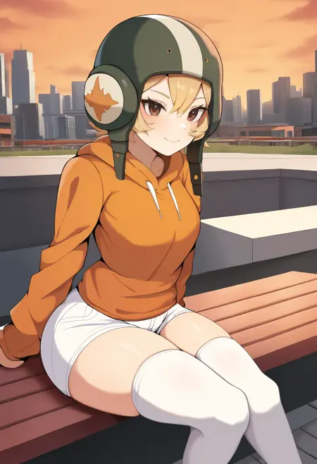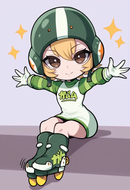 주요 옷차림을 사용할 경우: NGGumJSR, 단발, 금발, 눈 사이의 머리카락, 갈색 눈, 헬멧, 짧은 드레스, 긴 소매, 줄무늬 소매, 녹색 소매, 흰색 드레스, 옷에 쓰인 글자, 롤러스케이트, 흰색 장갑