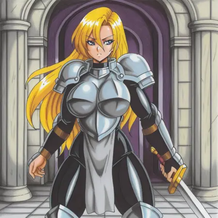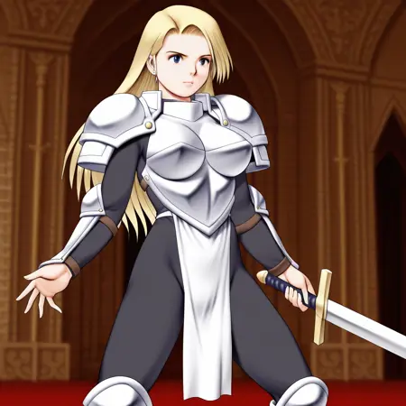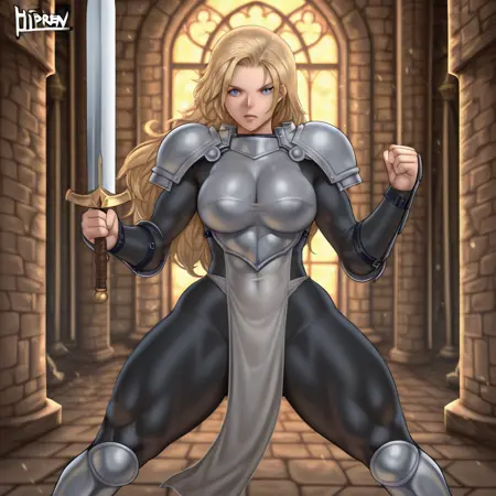 jeanne_ill, blonde hair, long hair, big breasts, armor, weapon, sword, shoulder armor, breastplate, pauldrons, boots, blue eyes, breasts, black bodysuit, (light grey pelvic curtain:1.6), fighting stance,