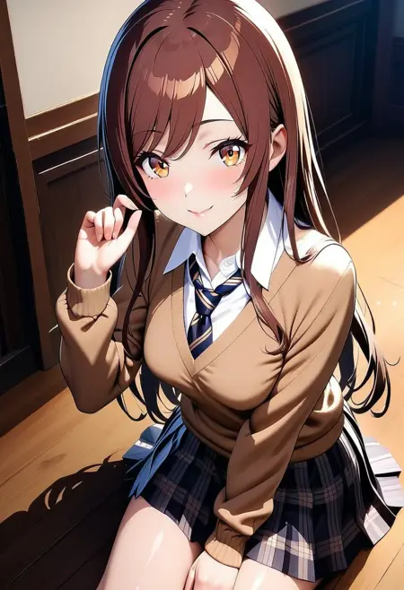 トリガー語: osaki_a_xl, osaki amana, 長い髪, 茶色の髪, 茶色の目, 黄色の目, 額の髪を横に流したスタイル, 小さな胸, 学校の制服, 白いシャツ, シャツ, ワイシャツ, ネクタイ, 斜めストライプのネクタイ, セーター, 茶色のセーター, 長袖, スカート, プリーツスカート, 黒いスカート, チェック柄のスカート,
