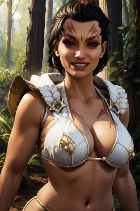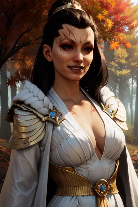 白色长袍或白色上衣,金色镶边,露胸,长袖或短袖,手套,紧身裤或裤子,骨盆帘幕,