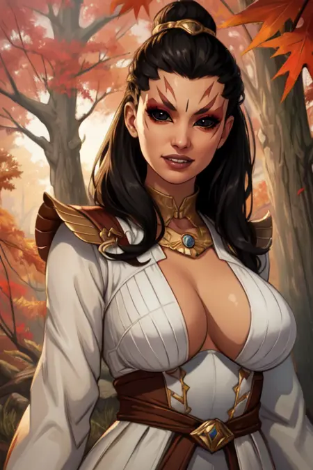 흰 로브 또는 흰 상의, 황금 테두리, 가슴 노출, 소매 또는 반소매, 장갑, 꽉 조이는 바지 또는 바지, 골반 커튼,