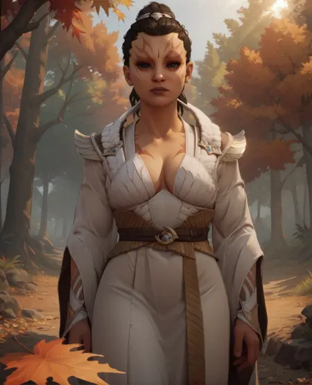 white robes, or white top, gold trim, cleavage, sleeves, or short sleeves, gloves, tight pants, or pants, pelvic curtain,
