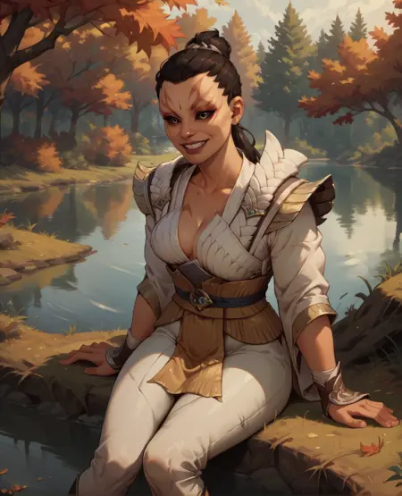 ashrah, black eyes, or black sclera, black hair, hair bun, ponytail,