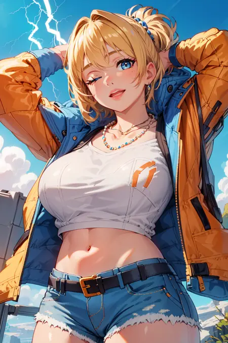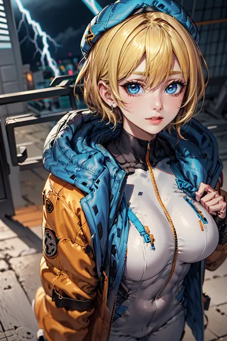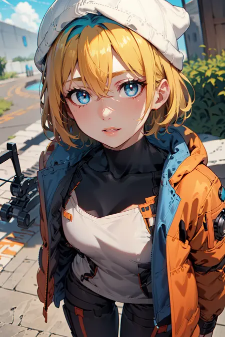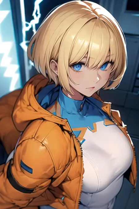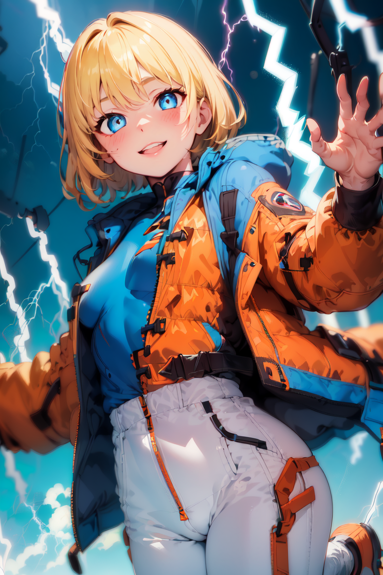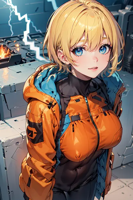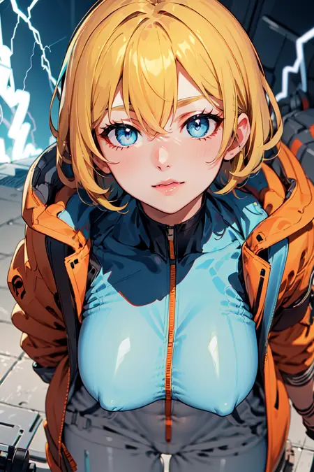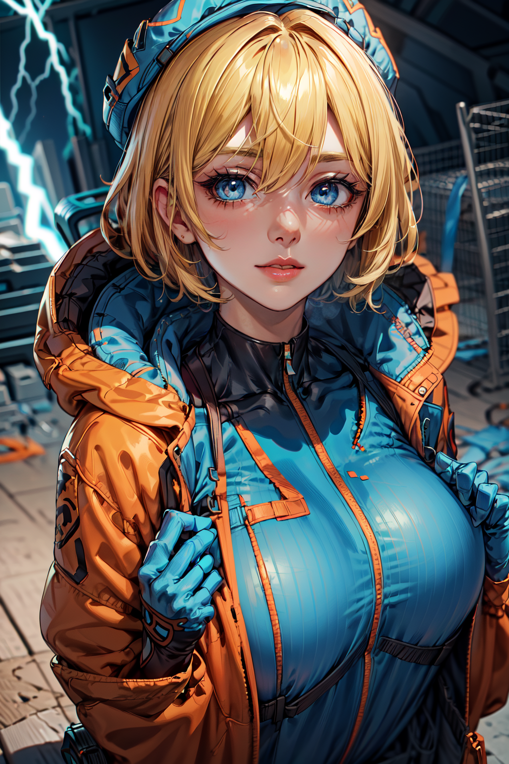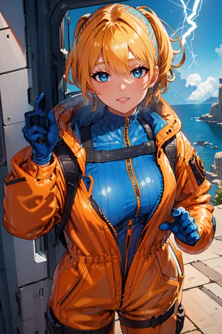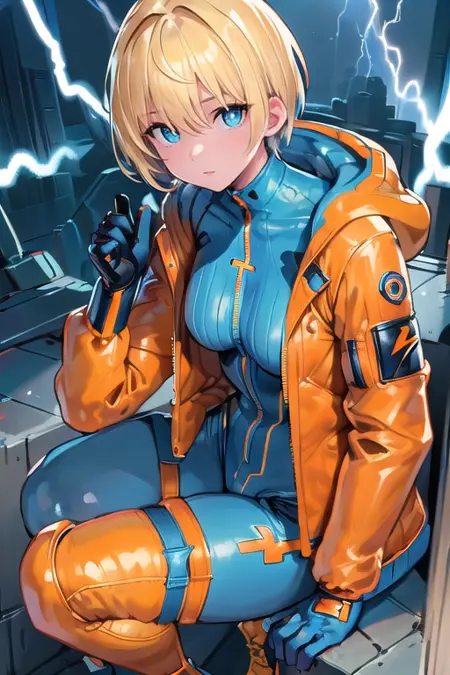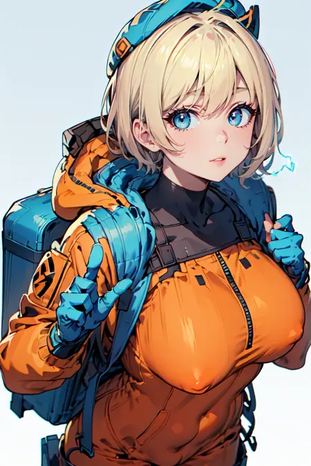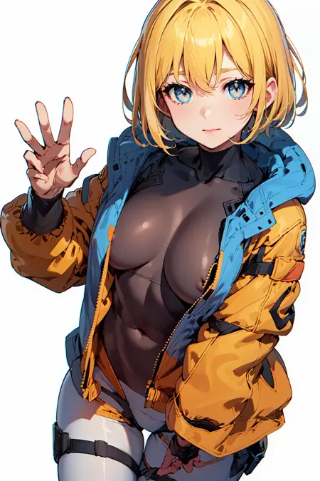 他の衣装の組み合わせ - フード付きボディスーツ、ボディスーツ、白いボディスーツ、フード、ジャケット、オレンジ色のジャケット、手袋、ひざパッド、フード付きジャケット、青い手袋、リブ加工ボディスーツ、青いボディスーツ、太ももストラップ、ケーブル、青い頭部装具