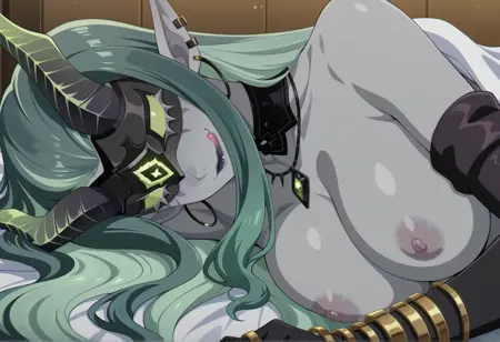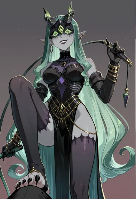 注目タグ: 非常に長い髪、複色の髪、緑の髪、とがった耳、イヤリング、耳の穿孔、灰色の肌、色付きの肌、マスク、角、ジュエリー、ネックレス、ロングドレス、肘まで手袋、鋭い爪、ブレスレット、太ももまでの靴下、サイドスリット