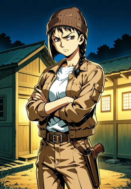 Chains of Freedom의 레나. 주 프롬프트는 "L3NACF"이며, 함께 "짧은 머리, 검은 머리, 땋은 머리"를 사용합니다. 게임 내 의상은 "빈니, 오픈 자켓, 셔츠, 갈색 자켓, 갈색 바지"입니다.