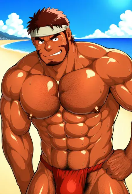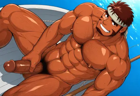 - 毛深汚れ、下品な兄貴系、巨根、禅担当。ポイントはざんばら髪とパンダナ、頬髭。外見的には「とにかくあざとく!」とのお達しでしたので、あざといラフを描いて一発でOKをもらって(笑)こんな感じになりました。もっと長髪にしても良かったかもとかバンダナ無しでも良かったかもとかこんなヒゲありえねえとか色々思う所はあるのですが、全体としてはイメージ通りにいったと思います。お気楽そうに見えて実は重く苦いものを内面に抱えている設定だったのですがあまりにもエロ指数が高く脳天気にやりまくってくれるので、シリアスな表情を描くのに試行錯誤した覚えがあります。隆一に加担した行為への賛否で好き嫌いが大きく別れていますが、それを考えるとやっぱり男は中身も大事だとつくづく思います。