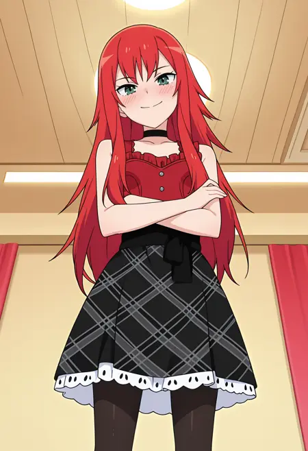 - pberrord, 黒いチョーカー, 袖なしシャツ, 赤いシャツ, 肩出し, ボタン, 黒いスカート, プラチッドスカート, フリル, 黒いパンスト,