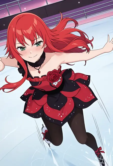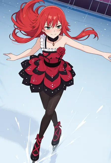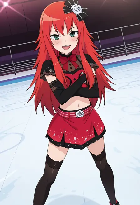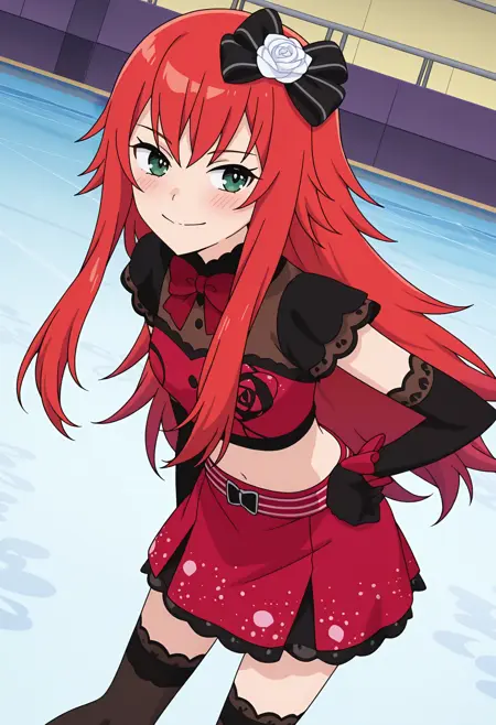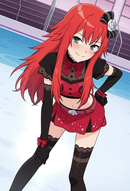 - pberwnrd, 髪飾り, 黒いリボン, 髪のリボン, 白い薔薇, 赤いクロップトップ, プリントシャツ, 腹部, 赤いネクタイ, 赤いスカート, 横縞ベルト, ミニスカート, 黒い袖, 肘まで手袋, 黒い手袋, 黒いタイツ,