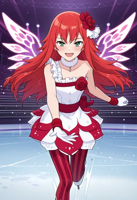 - pbersdpc, 红玫瑰, 头发花朵, 双色连衣裙, 毛边项圈, 白色项圈, 项链, 白色连衣裙, 红色连衣裙, 红玫瑰, 单肩带, 荷叶边肩带, 露肩, 白色手套, 红色腕带, 红色连裤袜, 条纹连裤袜, 垂直条纹连裤袜, 全息翅膀,