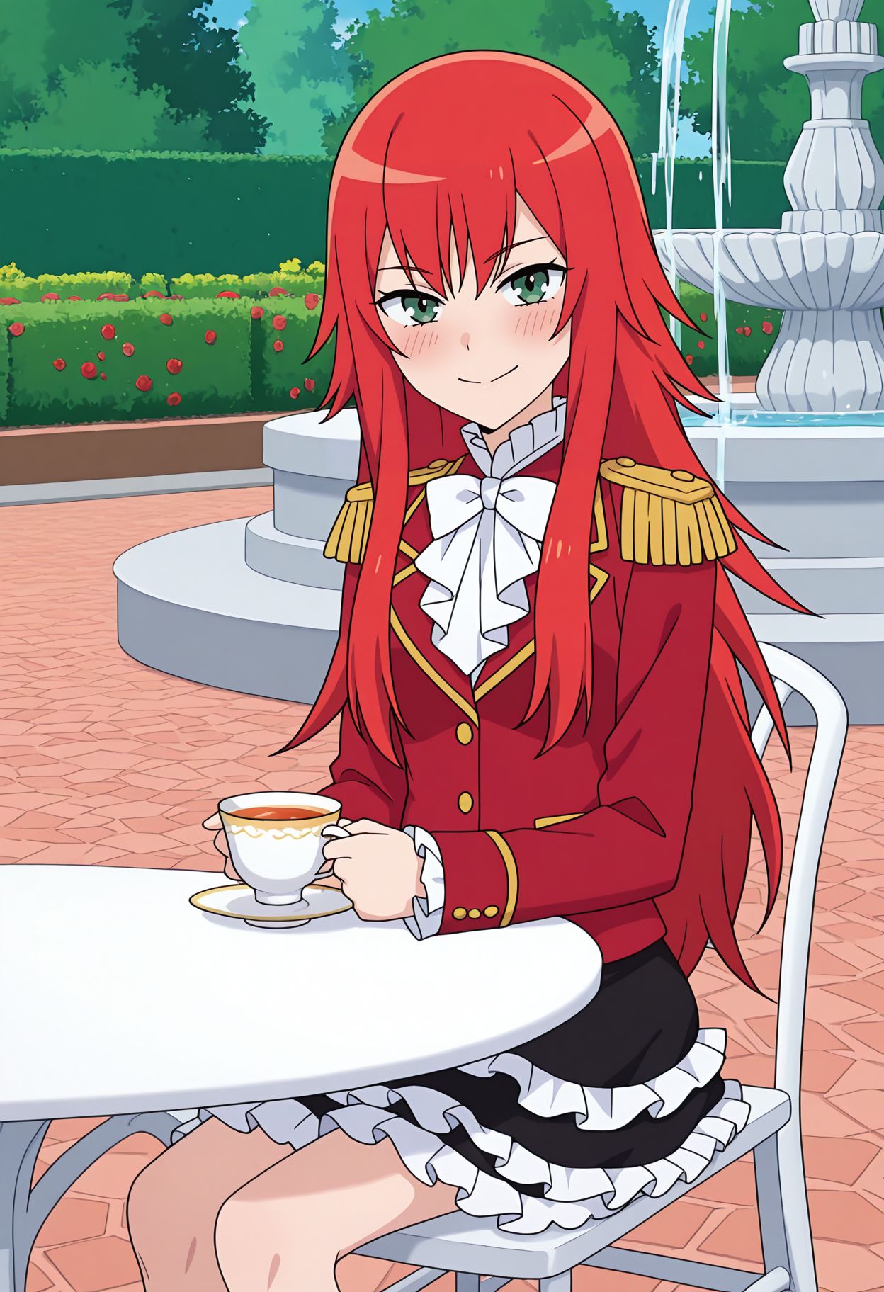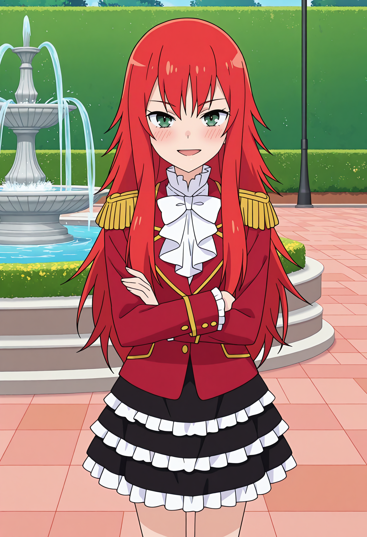 - pberedel, 肩章, アギュイエット, 赤いジャケット, 白いアスコット, フリル, 長袖, 黒いスカート, レイヤードスカート, フリル付きスカート,