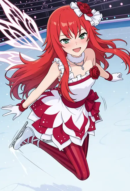- pbersdpc, 赤い薔薇, 髪の花, 2色使いのドレス, ファー縁取りのチョーカー, 白いチョーカー, ネックレス, 白いドレス, 赤いドレス, 赤い薔薇, 片肩ストラップ, フリル付きストラップ, 肩出し, 白い手袋, 赤いリストバンド, 赤いパンスト, 横縞パンスト, 縦縞パンスト, ホログラフィックウィング,