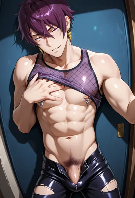 VioletES, Violet_OG, Violet_OG_purple_hair, Violet_OG_purple_eyes, Violet_OG_cross_earring, Violet_OG_red_jacket, Violet_OG_white_shirt, Violet_OG_black_tie, Violet_OG_heart_belt, Violet_OG_red_plaid_pants, Violet_OG_black_boots