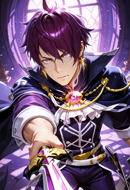 VioletES, Violet_OG, Violet_OG_purple_hair, Violet_OG_purple_eyes, Violet_OG_cross_earring, Violet_OG_black_cape, Violet_OG_gold_chain, Violet_OG_purple_shirt, Violet_OG_gem_brooch, Violet_OG_white_frills, Violet_OG_purple_pants, Violet_OG_boots