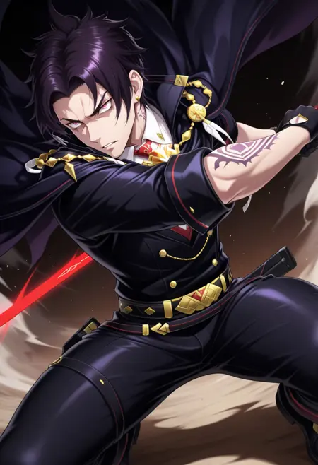 VioletES, Violet_R, Violet_R_black_hair, Violet_R_red_eyes, Violet_R_scar_left_eye, Violet_R_tribal_tattoo_right_arm, Violet_R_black_cape, Violet_R_gold_ornaments, Violet_R_red_tie, Violet_R_black_jacket, Violet_R_white_shirt, Violet_R_black_gloves, Violet_R_black_pants