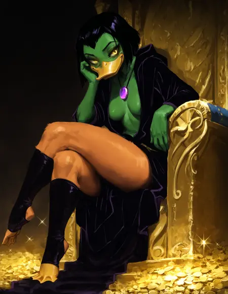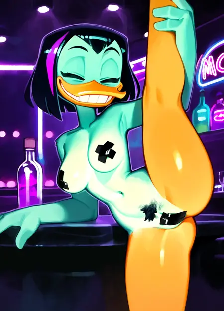 magica de spell, female, anthro, duck, beak, black hair, short hair, purple highlights, widow's peak, short tail, yellow eyes, bags under eyes, orange legs, webbed feet,