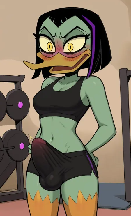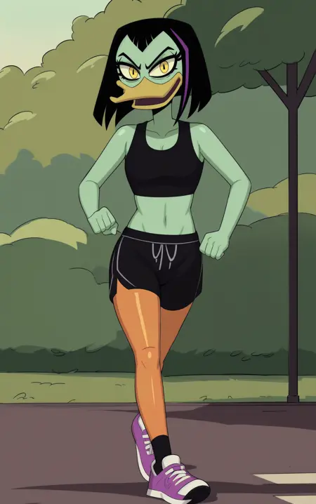 magica de spell, female, anthro, duck, beak, black hair, short hair, purple highlights, widow's peak, short tail, yellow eyes, bags under eyes, orange legs, webbed feet,