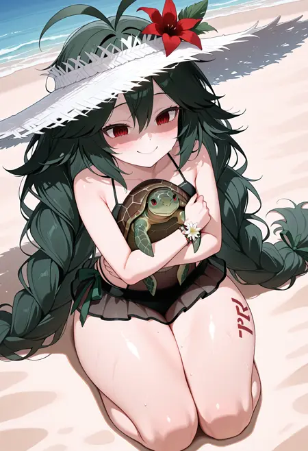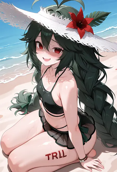 - trrclsum, 低いツイン編み髪, わら帽子, 白い頭部装飾, 帽子の花, 黒のビキニ, 複数ストラップのビキニトップ, 緑のリボン, ブレスレット, ビキニスカート, 透け感のあるドレス,