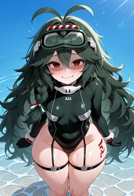 trrcldef, 横編み髪, イタリア国旗, 頭にゴーグル, ダイビングマスク, 黒のワンピース水着, ボディスーツ, ハイレグ, 長い袖, 手袋, 太ももストラップ, ガーター straps, 足先が開いたレッグウェア,