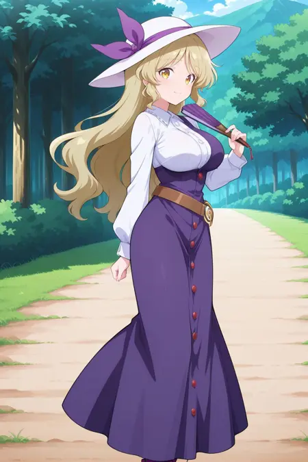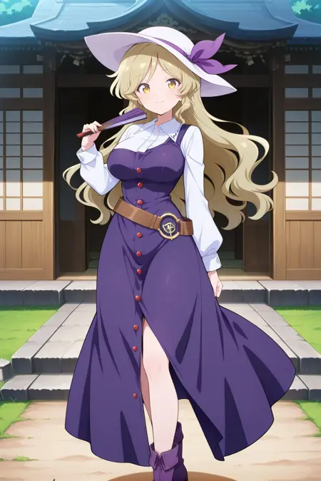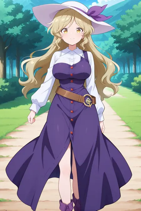 white hat, hat riibon, purple ribbon, white shirt, long sleeves, pinafore dress, purple dress, single strap, long dress, buttons, brown belt, loose belt, purple boots,