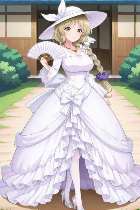 watatsuki no toyohime, 1girl, solo, long hair, large breasts,, watatsuki no toyohime \(white peach fragrance princess\), alternate costume, alternate hair color, alternate hairstyle, single braid, brown eyes, brown hair, white hat, hair ornament, hair ribbon, white ribbon, purple scrunchie, necklace, jewelry, wedding dress, white dress, supportasse, high-low dress, long sleeves, necklace, back bow, white bow, white pantyhose, high heels, white footwear, hand fan,