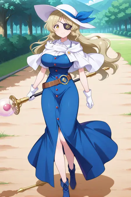 watatsuki no toyohime \(plentiful temple of wealth and equality\), alternate costume, alternate hair color, brown hair, white hat, hat ribbon, blue ribbon, eyepatch, white capelet, white shirt, short sleeves, pinafore dress, blue dress, single strap, long dress, buttons, white gloves, brown belt, loose belt, blue footwear, holding staff, holding candy,