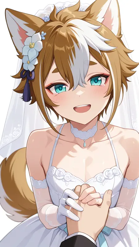 gorou (genshin impact), dog boy, dog ears, dog tail, animal ears, aqua eyes, brown hair, white hair, multicolored hair, streaked hair, hair between eyes, tail, animal ear fluff, thick eyebrows,