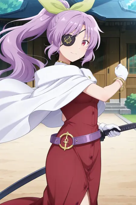 watatsuki no yorihime, 1girl, solo, red eyes, puple hair, long hair, ponytail, small breasts, watatsuki no yorihime \(peace temple of modesty and devotion\), alternate costume, hair ribbon, green ribbon, white capelet, eyepatch, red dress, open dress, pinafore dress, sleeveless dress, buttons, purple belt, loose belt, bracelet, white gloves,