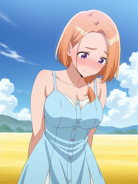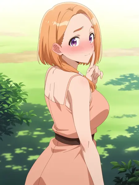 1girl, short hair, purple eyes, orange hair, hair over shoulder, low ponytail, banri_shiunji