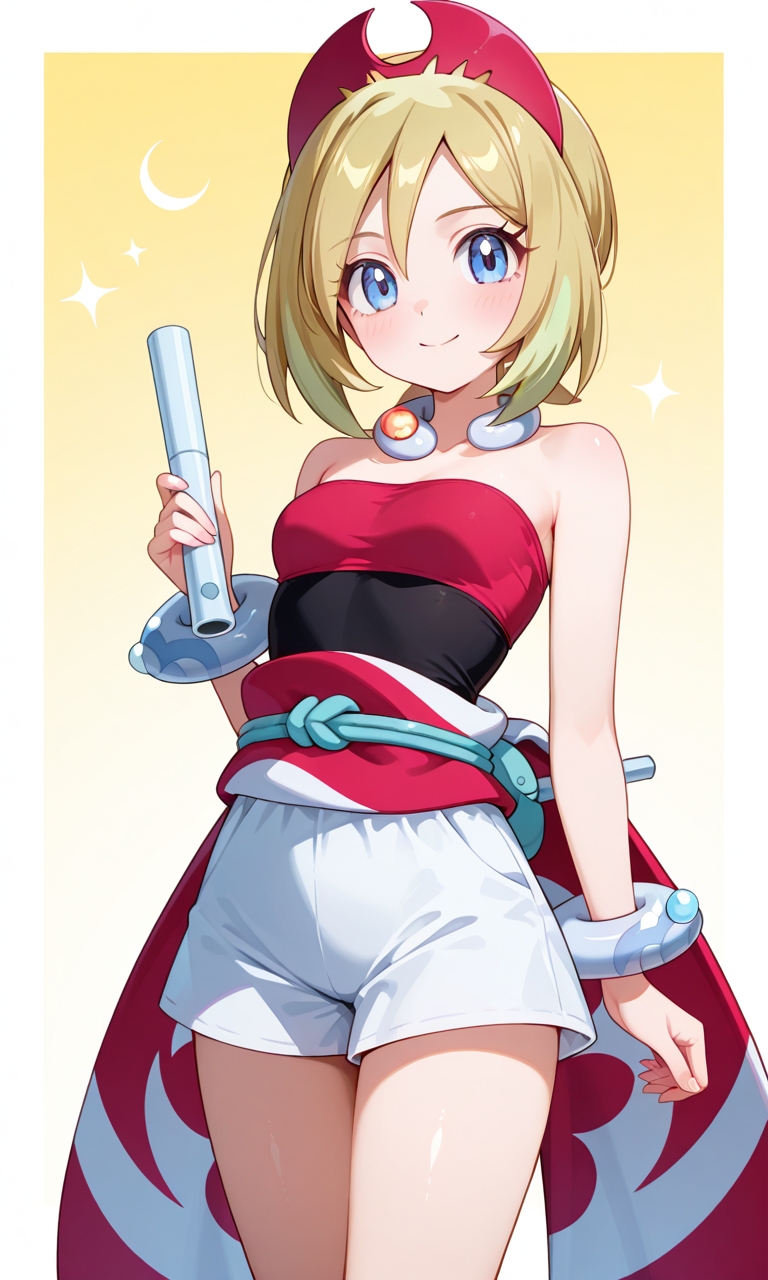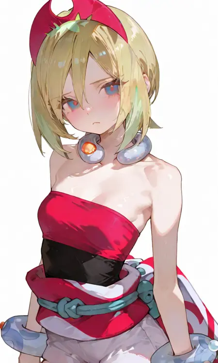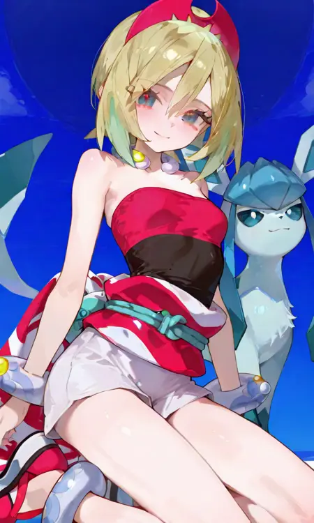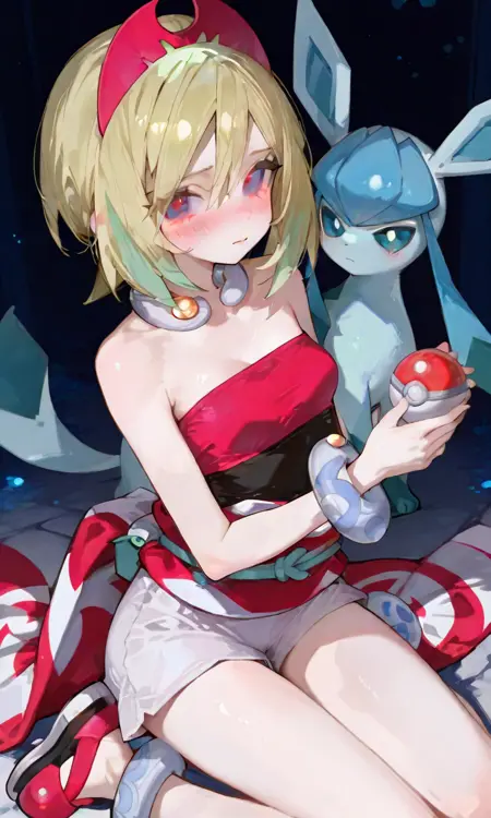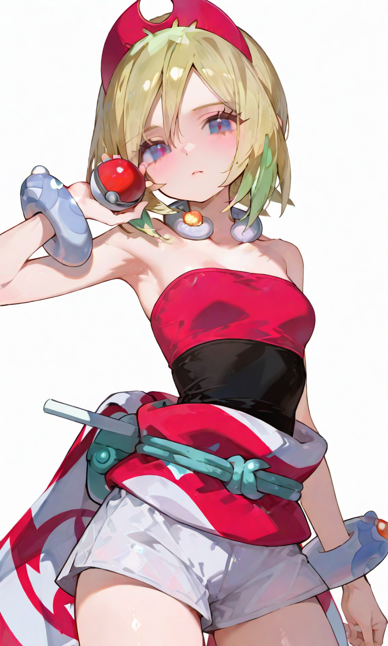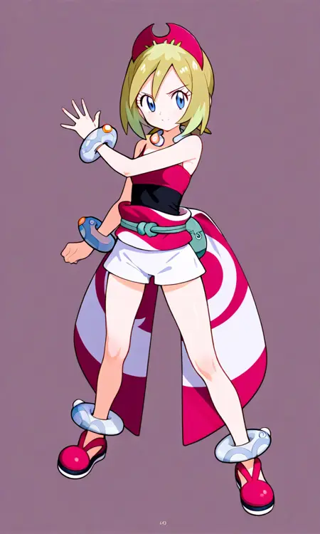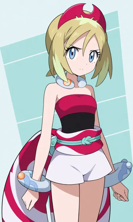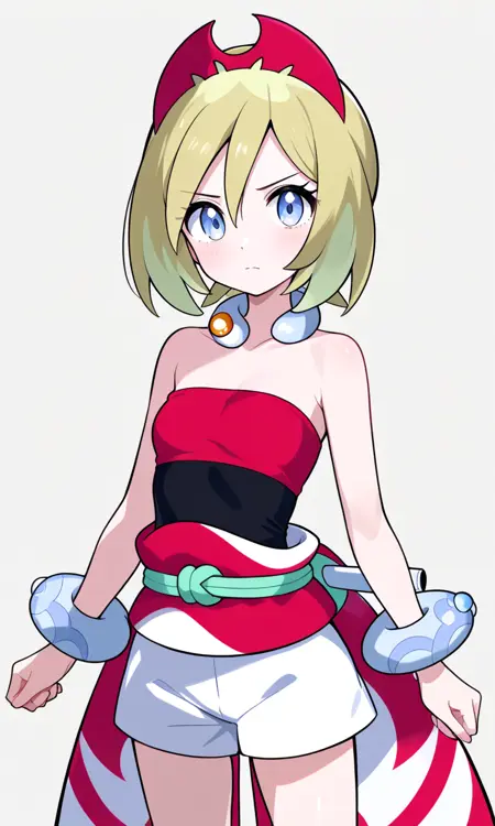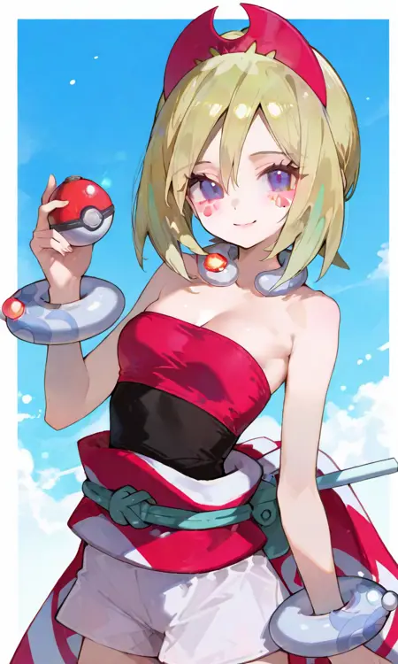 기본 키워드: Irida (POKÉMON), 짧은 금발, 밝은 하이라이트, 계층적인 헤어스타일, 사이드 앞머리, 빨간 뿔 모양 헤드밴드, 큰 파란 눈, 하얀 피부, 마른 체형, 작은 가슴