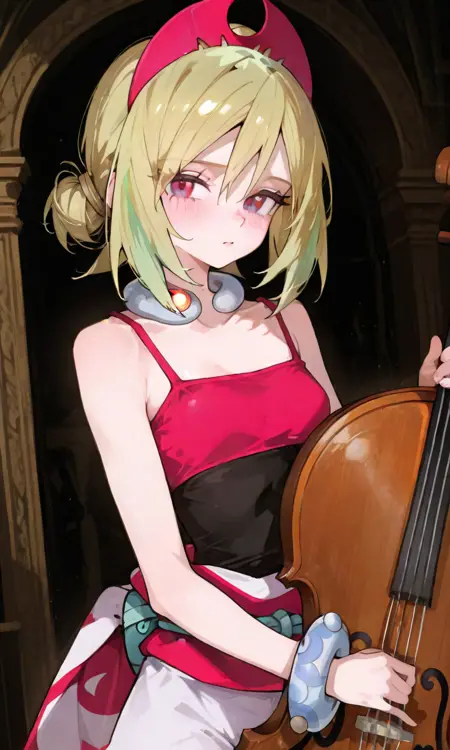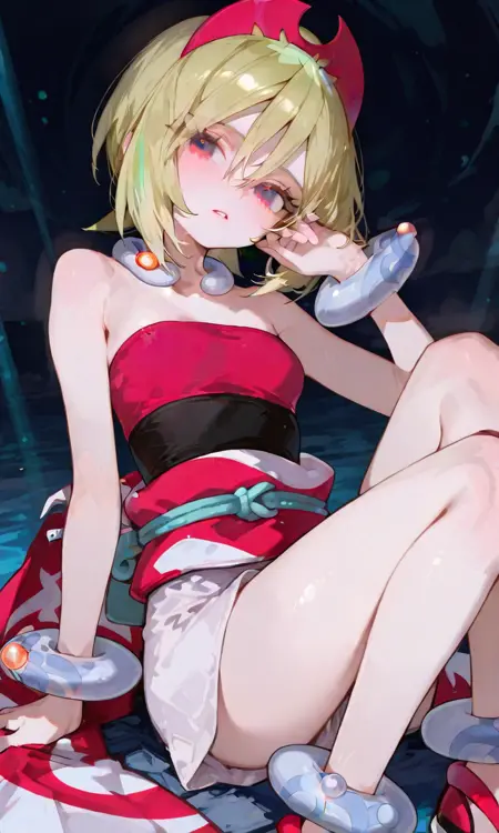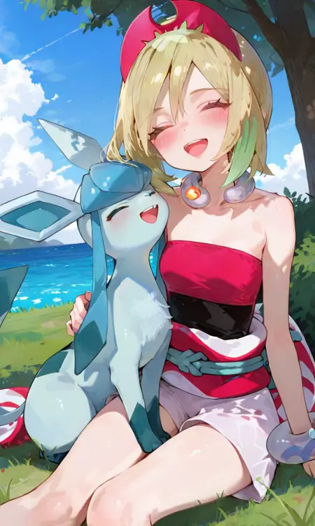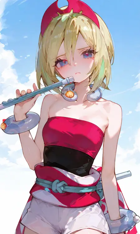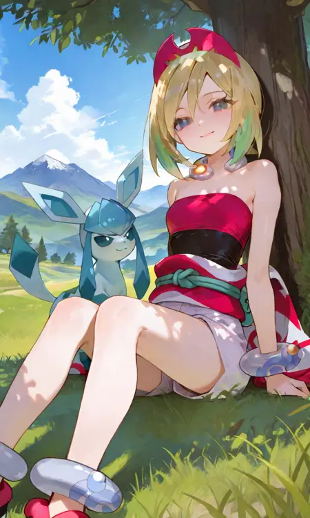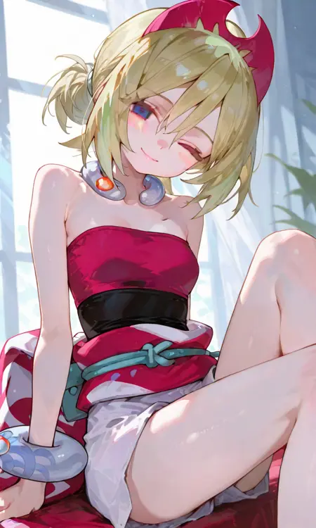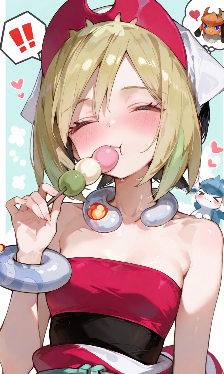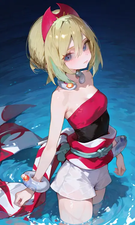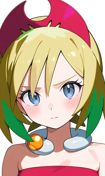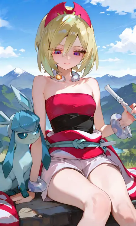 기본 키워드: Irida (POKÉMON), 짧은 금발, 밝은 하이라이트, 계층적인 헤어스타일, 사이드 앞머리, 빨간 뿔 모양 헤드밴드, 큰 파란 눈, 하얀 피부, 마른 체형, 작은 가슴