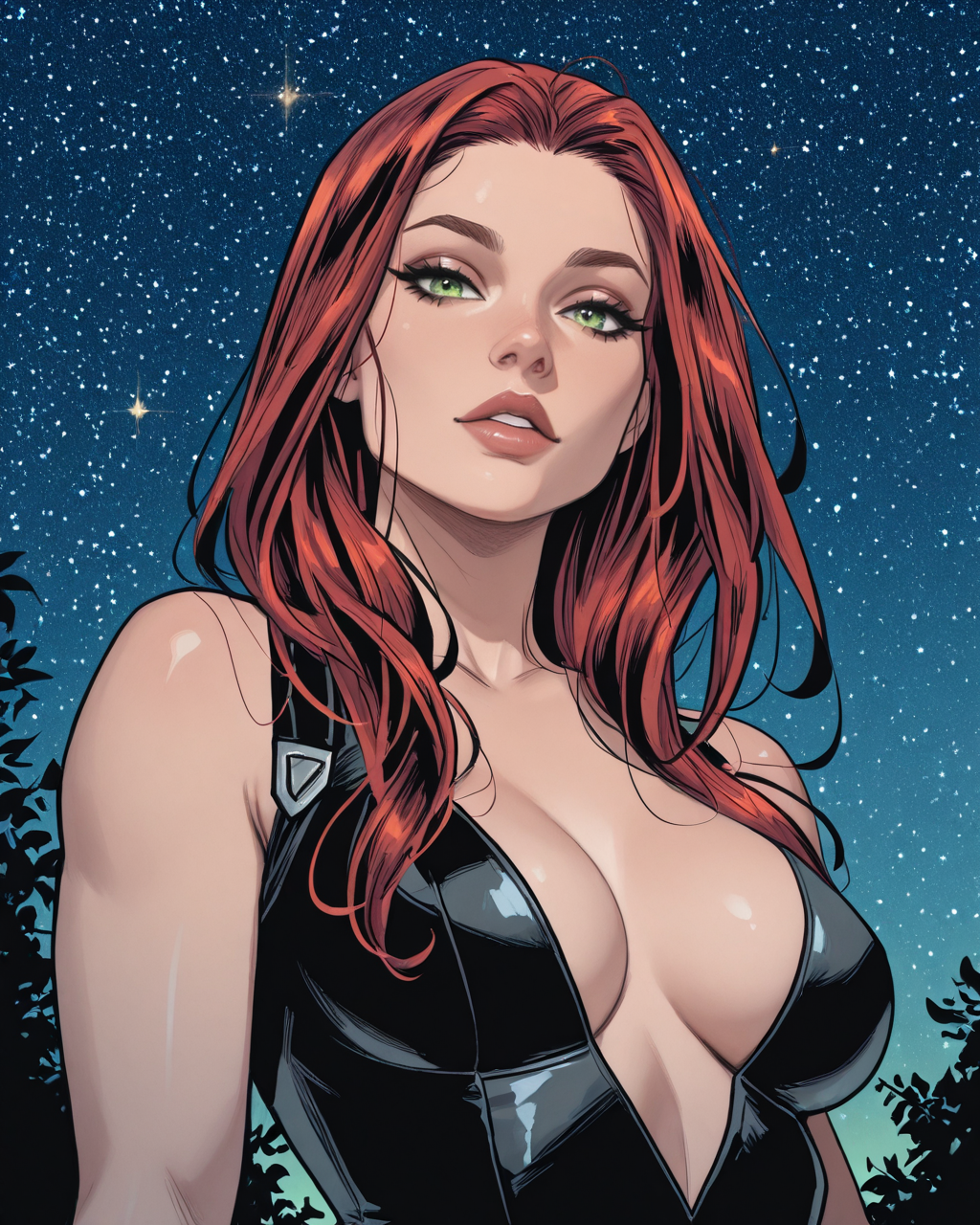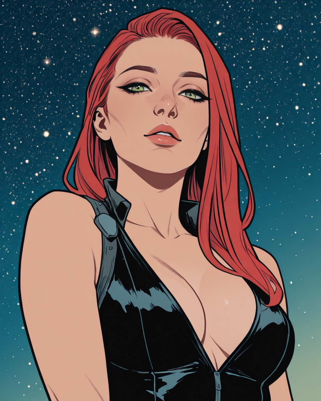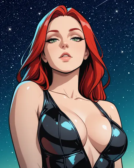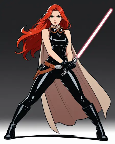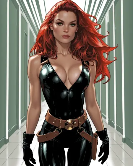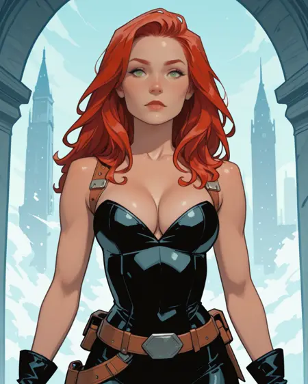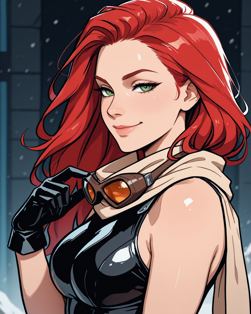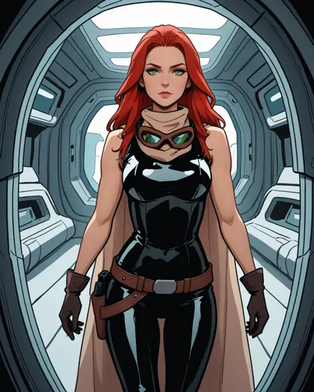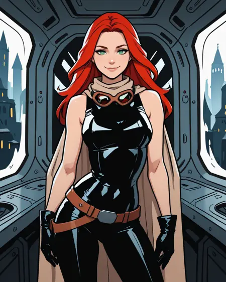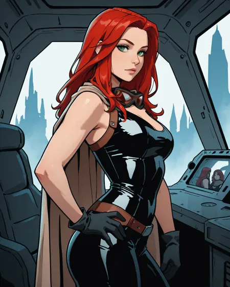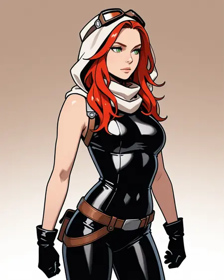 트리거: marajade, 빨간 머리, 긴 머리, 녹색 눈, 바디수트, 벨트, 장갑, 망토, 스카프, 목에 안경
