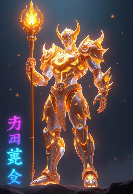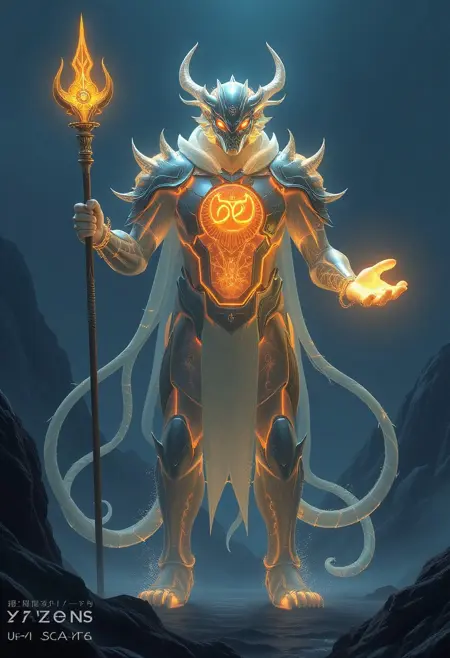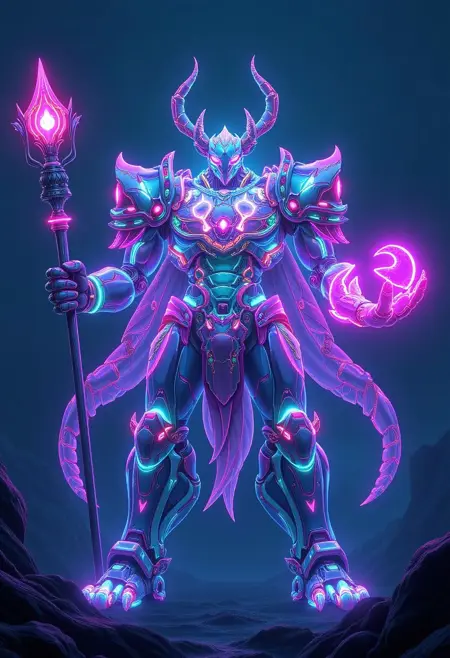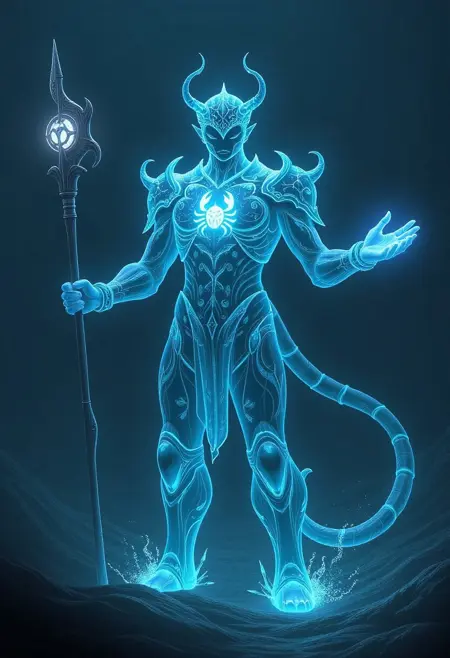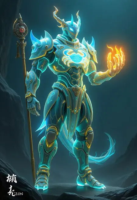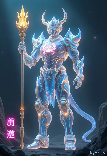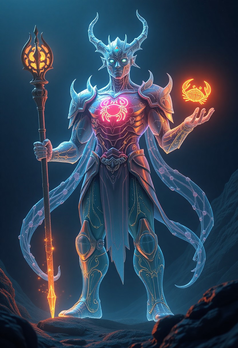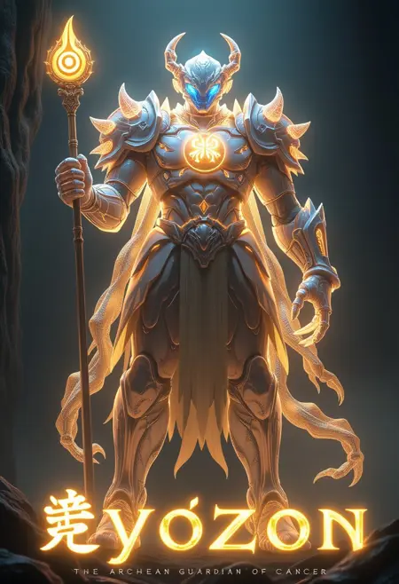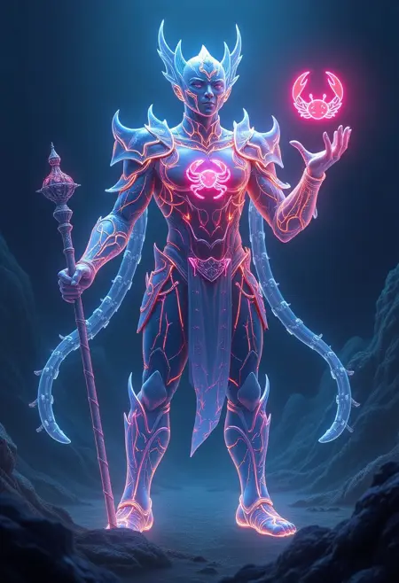 一位令人敬畏的生物发光半透明古菌/类人生物,挺拔而庄严地站立在黑暗神秘的环境中,该环境仿佛融合了古老与未来元素。其身体由令人着迷的活体生物组成,散发出柔和的光芒,展现出类似古菌微观之美般的精细图案与结构。其铠甲 reminiscent of 第四星座巨蟹座,透明而闪耀,胸甲上以霓虹灯勾勒出巨蟹座螃蟹的轮廓,为全身投射出超凡的光辉。铠甲设计是生物技术与有机生长的杰作,与古菌的体态完美融合。该生物一手持发光权杖,象征权力与权威;另一手张开,掌心向外,展示出脉动的霓虹巨蟹座符号。左下角以霓虹灯艺术化地刻有日文“kyōzon”,增添了一抹日本赛博朋克风格。古菌的双眼锐利而聪慧,暗示着其身旁漂浮的角色面板上列出的15种独特超能力。每种能力均以霓虹灯点缀的图标呈现,涵盖操控空间结构到控制元素力量等,这些能力均与其生物构成及星座主题紧密关联。标题为:“kyōzon,巨蟹座的古菌守护者:释放深渊之光”。此图像捕捉了一位异界守护者的精髓——由古老的星象知识与未来生物工程融合诞生,准备 harness 宇宙与深海的力量以造福众生。超现实主义,杰作,32k,