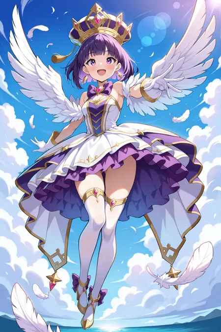 Magicaorigin: magicaorigin,王冠,肩章,宝石,耳环,紫蝴蝶结,领结,白裙,露肩,羽毛,白手套,层叠裙,金边,白长筒袜,高跟鞋,