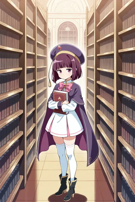Magica2020: magica2020,紫色头饰,宝石,贝雷帽,肩章,紫色披风,领结,粉红蝴蝶结,白裙,长袖,白长筒袜,高跟靴,