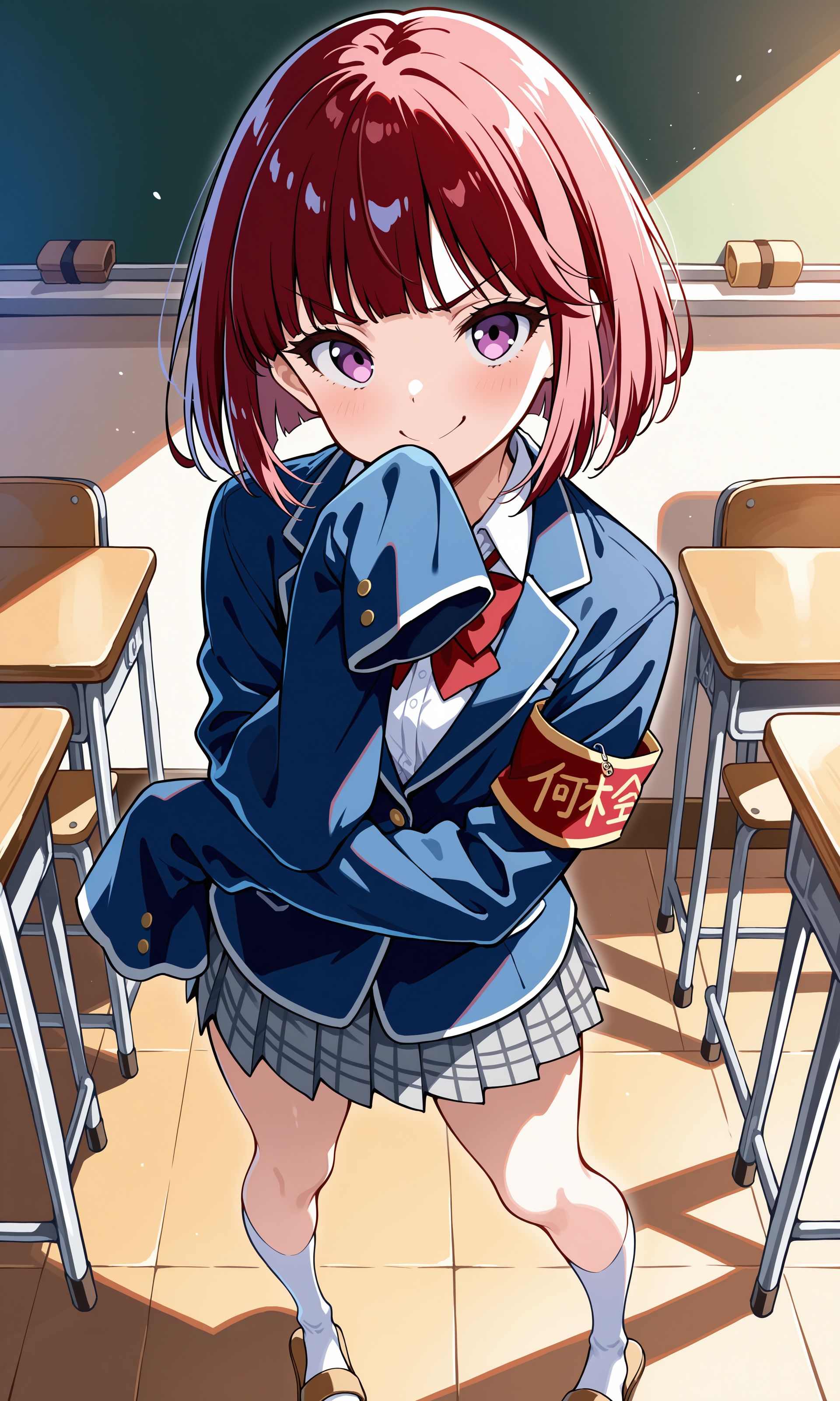 校服: 校服,西装外套,臂章,长袖,袖子过手,红色领结,白衬衫,百褶裙,格子裙,灰裙,白袜,凉鞋