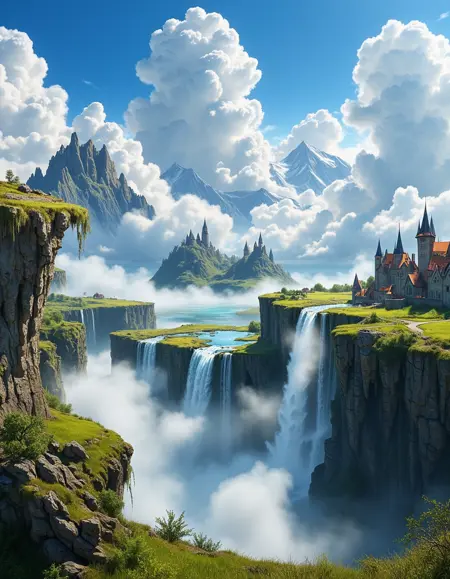 T10:風景、山、波、岩、木、植物、苔、荒れ海、滝、(城の)遺跡、日没、青、オレンジ、黄、茶