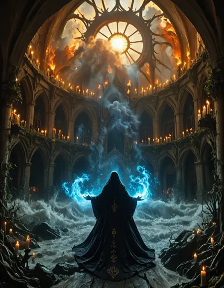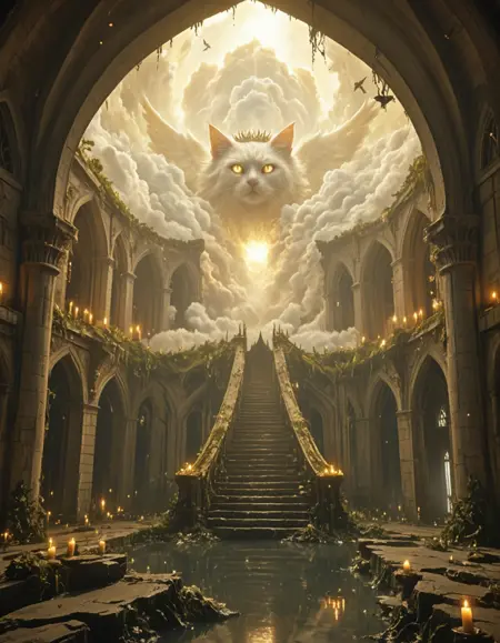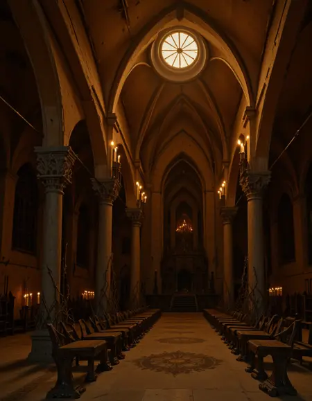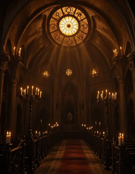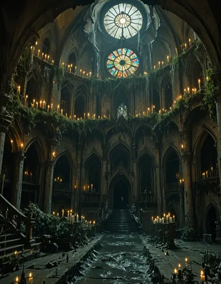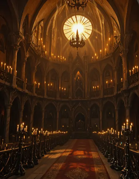 MA0, gold room, medieval, candles, gold carvings, huge room, huge big rosace stained glass windows, huge skylight, irregular arches, detailed wall carvings, irregular architecture, stairway, very high ceiling, worn, old,