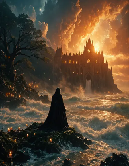 T10, landscape, mountains, waves, rocks, tree, vegetation, moss, rough sea, waterfall, (castle) ruins, sunset, blue, orange, yellow, brown,